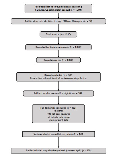 Prioritized peer-reviewed articles and authoritative reports from reputable organizations such as the Food and Agriculture Organization (FAO) and the Environmental Protection Agency (EPA). The extracted relevant data and information from selected studies include emission factors, influencing factors, mitigation strategies, and environmental impacts associated with different types of livestock operations.